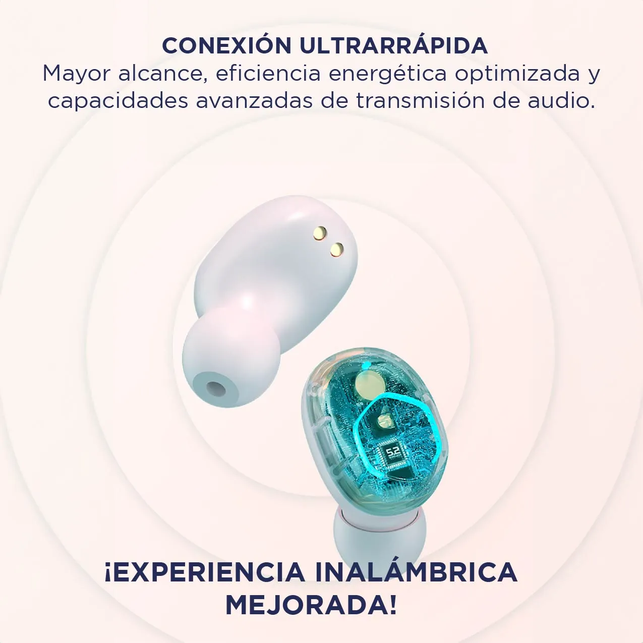 - Capacidad de Batería: 40mAh en cada auricular y 250mAh en el estuche de carga para horas de entretenimiento.