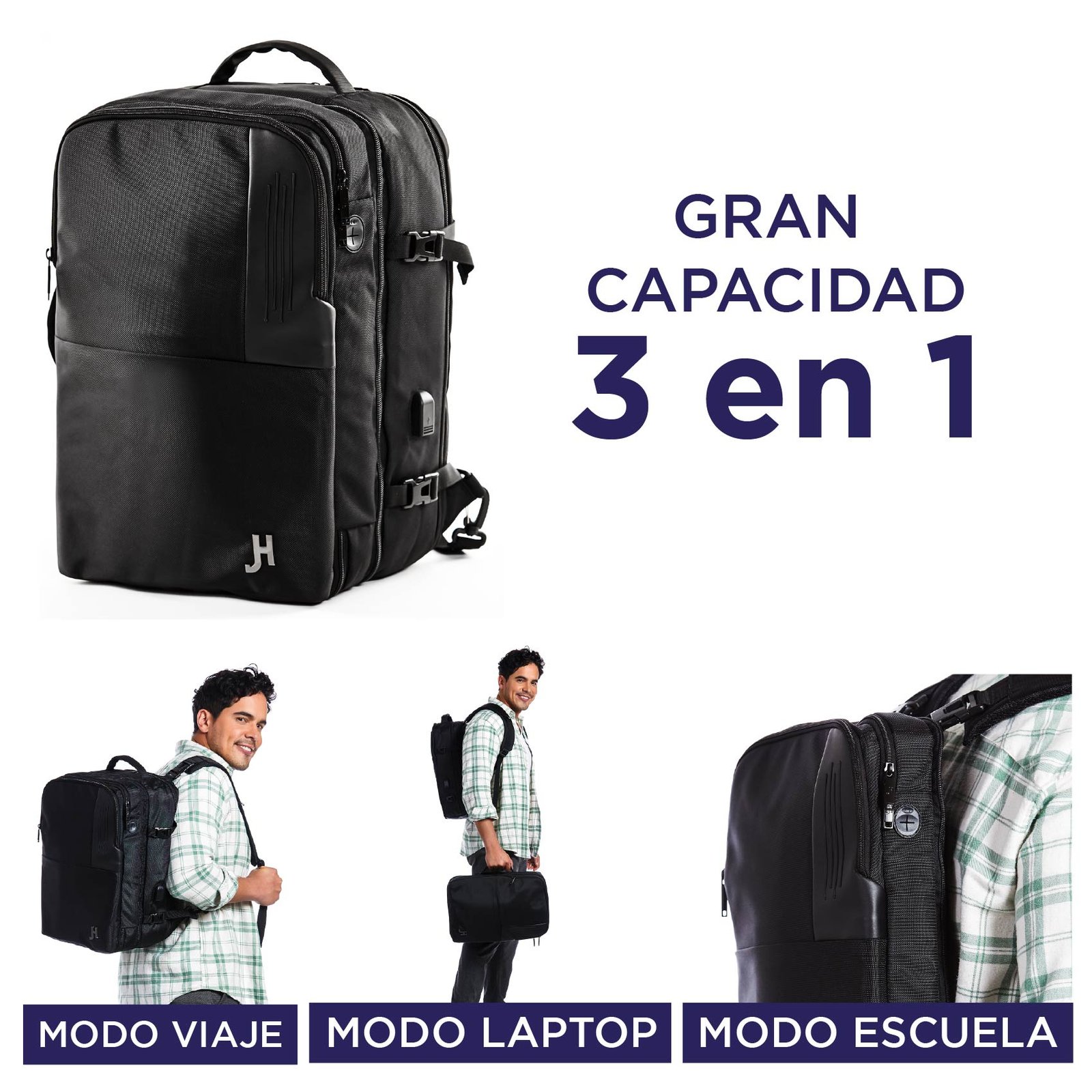Mochila 3 en 1 Multifuncional – Adapt: Descubre la versatilidad sin precedentes con nuestra mochila desmontable. Diseñada para el dinamismo del día a día, se separa en dos secciones independientes: una elegante mochila de negocios para tu laptop de hasta 17.3 pulgadas y una práctica mochila de viaje, espaciosa para guardar ropa y esenciales para 4-7 días. Con una bolsa impermeable integrada, es tu compañera ideal tanto para escapadas urbanas como para viajes de negocios.